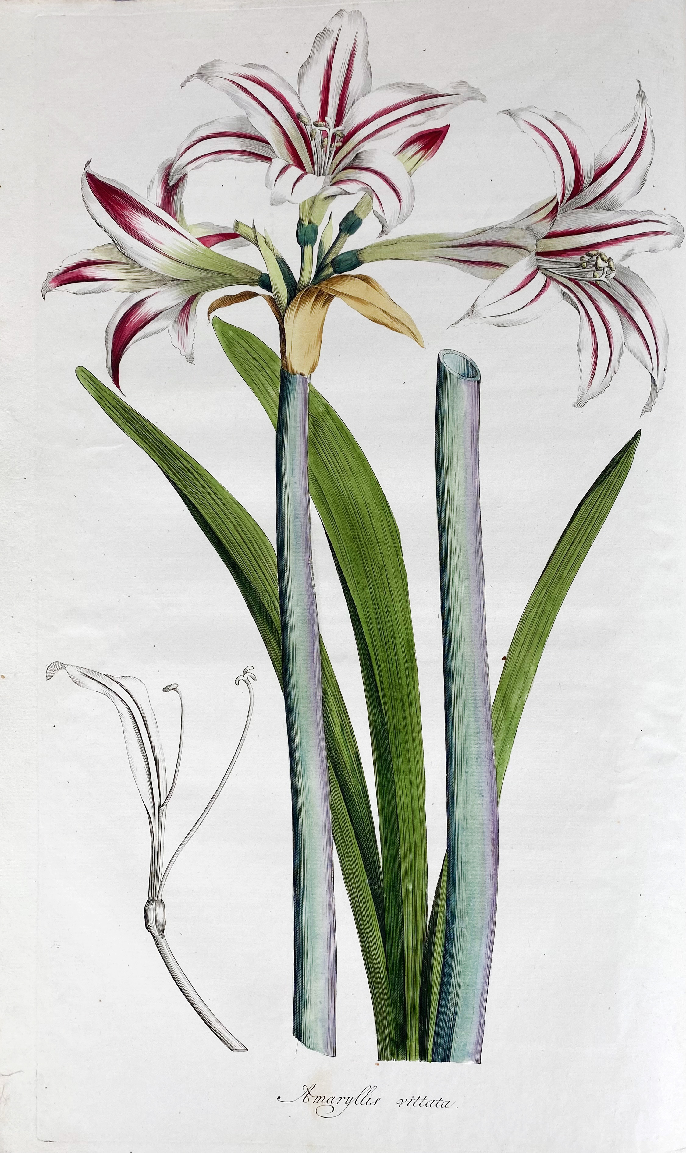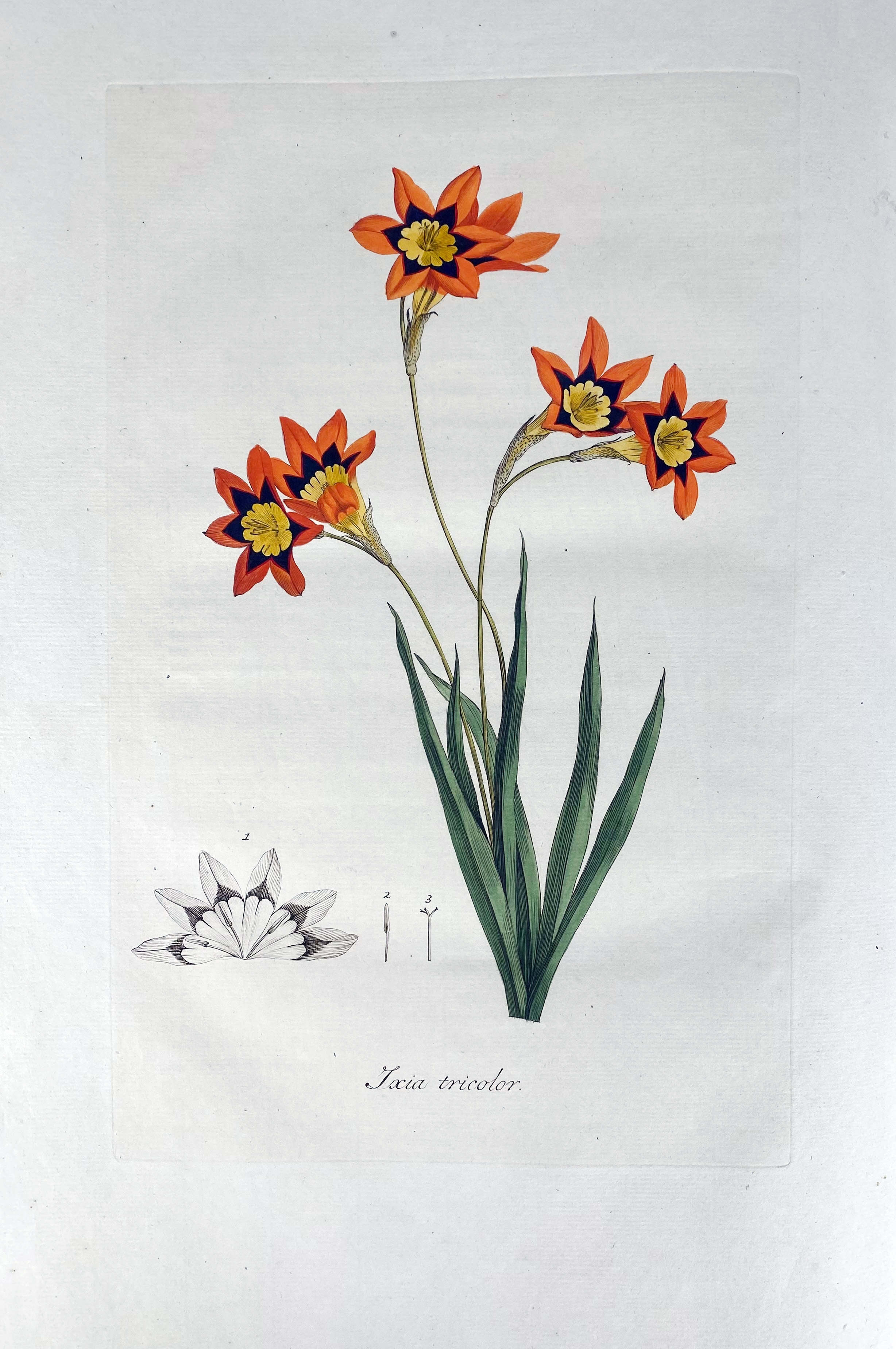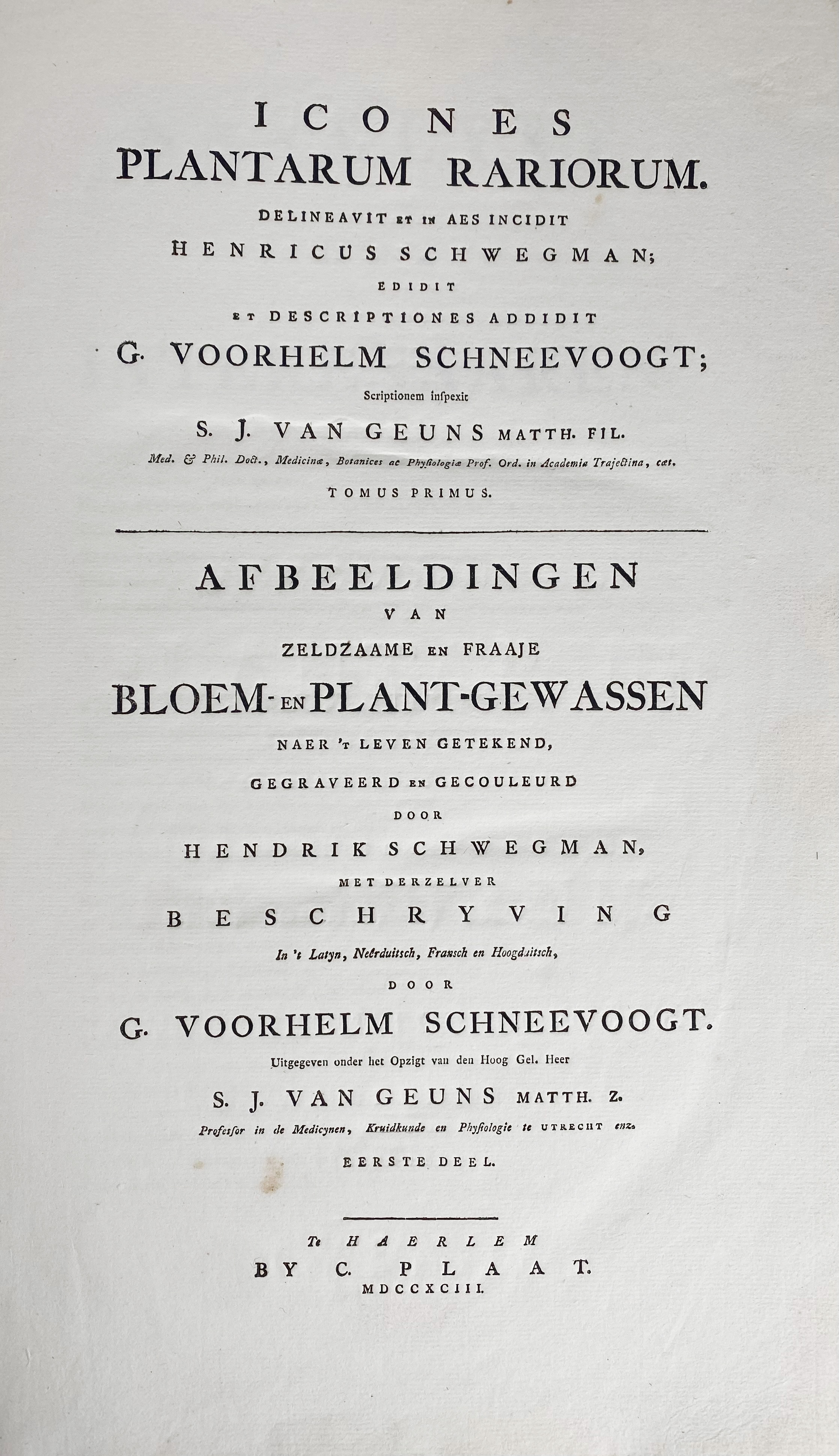 BOTANY -- SCHNEEVOOGT, G. Voorhelm. Icones Plantarum Rariorum. Afbeeldingen van zeldzaame en fraaije Bloem- en Plant-Gewassen. Haarlem, C. Plaat, [1792-]1793[-1795]. W. 48 beautifully handcold. plates engr. by and after H. Schwegman & P. van Loo (1 uncold. plate), w. accomp. text-leaves. Lge-fol. Cont. brds. (Bind. rubbed, paper on spine partly gone, corners bumped, but in impeccable interior condition: extremely clean and wide-margined).