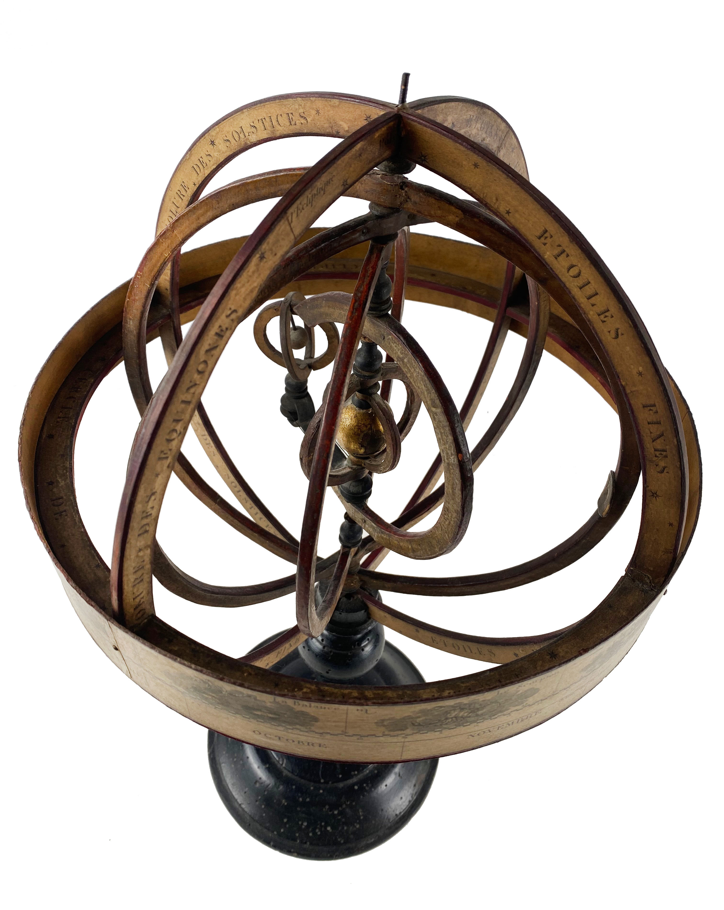 ARMILLARY SPHERE. France (?), 19th c. French wooden heliocentric sphere. Ø 285, 460 mm (h), incl. black wooden pedestal. (The pedestal shows signs of worming, the sphere itself a bit darkened, some of the gilding of the sun is worn, but altog. in good condition).