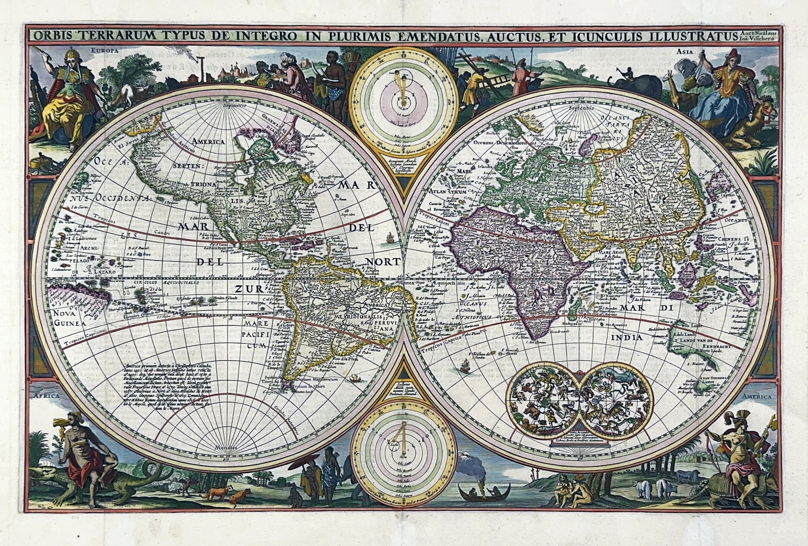 WORLD MAPS -- "ORBIS TERRARUM de integro in plurimis emendatus, auctus, et icunculis illustratus". (Amst., N.J. Visscher, c. 1657). Engr. world map in cont. colouring. 310 x 483 mm. (Skilfully closed splits in blank margins, 3 vertical folds faintly visible, slightly discold. at foot of central fold, but in v.g. condition).