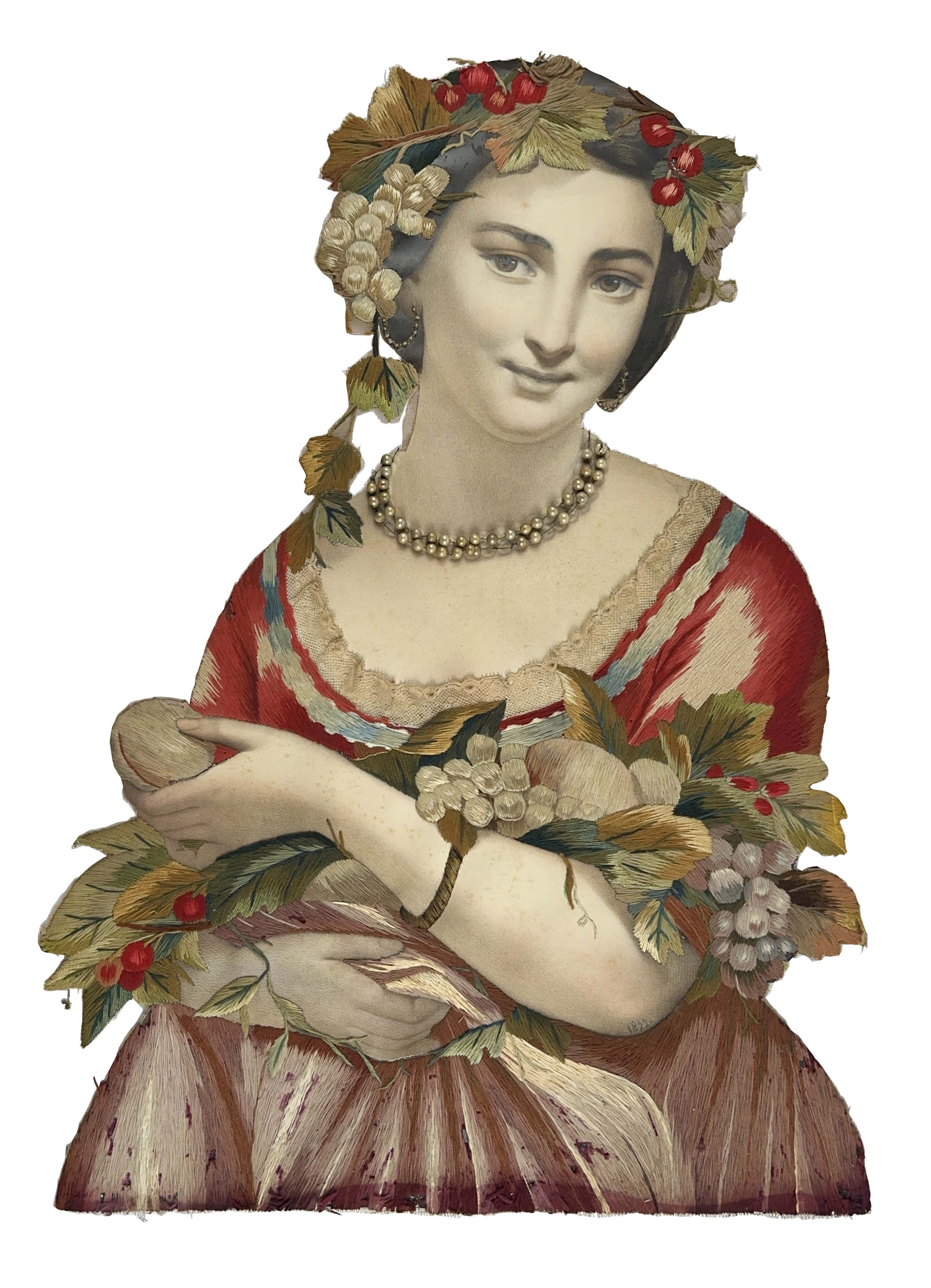 TEXTILE ARTS - EMBROIDERY -- (HALF-LENGTH PORTRAIT OF A WOMAN). (France?, 2nd half 19th c.?). Delicately cold. lithograph portrait w. silk embroidered (head-)dress with fruits & flowers, lace collar, metal & beads earrings, metal & artificial pearl beads double necklace. 650 x 460 mm (highest & widest parts of the image). (Print w. some light foxing, a bit of the jute background material showing at the edges of the work, a few of the pearl beads lacking, some yarn at the top coming loose, near the bottom some of the yarn may have been affected by moths(?), a very pretty and curious piece of craftswomanship).