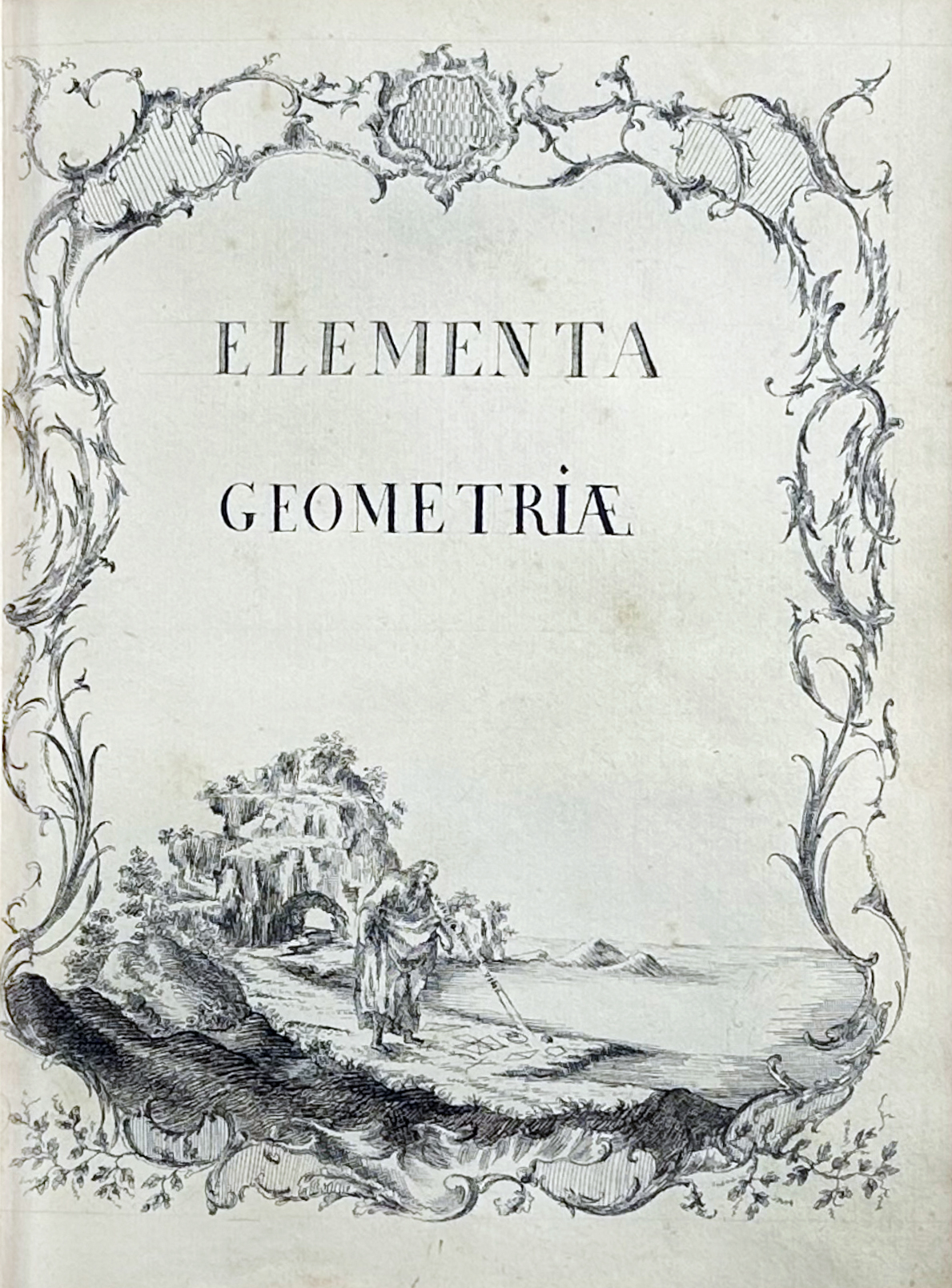 "ELEMENTA GEOMETRIÆ. Elementorum geometriæ liber primus doctrina proportionum et progressionum tum arithmethicarum tum geometricarum". (18th c.). Latin manuscript on paper. 93 lvs. (incl. 4 blanks). W. calligraphic title-page within an elaborate ornamental border and an allegorical scene, section title also within ornamental border, executed in pen and ink, text written in a neat and uniform hand with numerous beautiful executed allegorical vignettes, all executed in pen and ink. 4°. Cont. mottled cf. w. raised bands, dec. gilt spine, brown letterpiece, all edges red, marbled endpapers. (Spine a bit dam., corners worn, bind. chafed/rubbed).