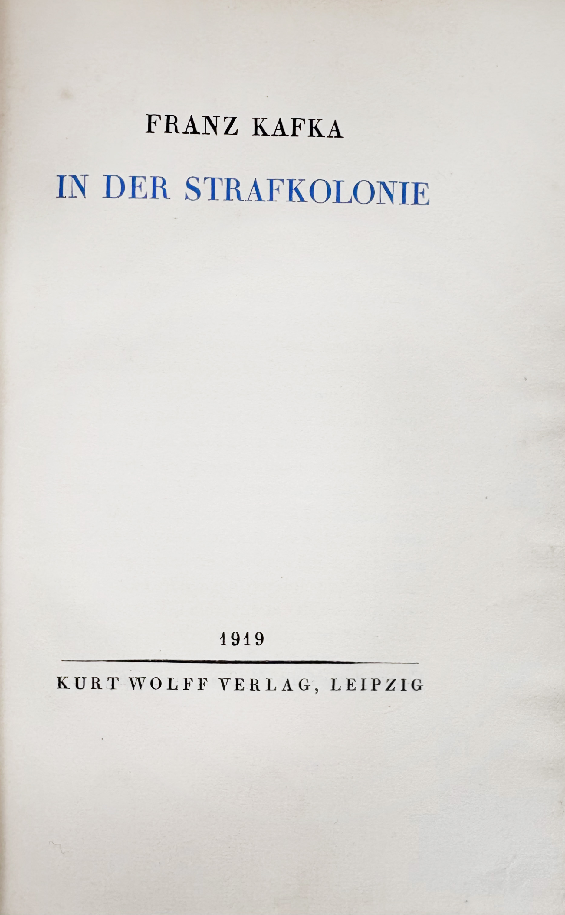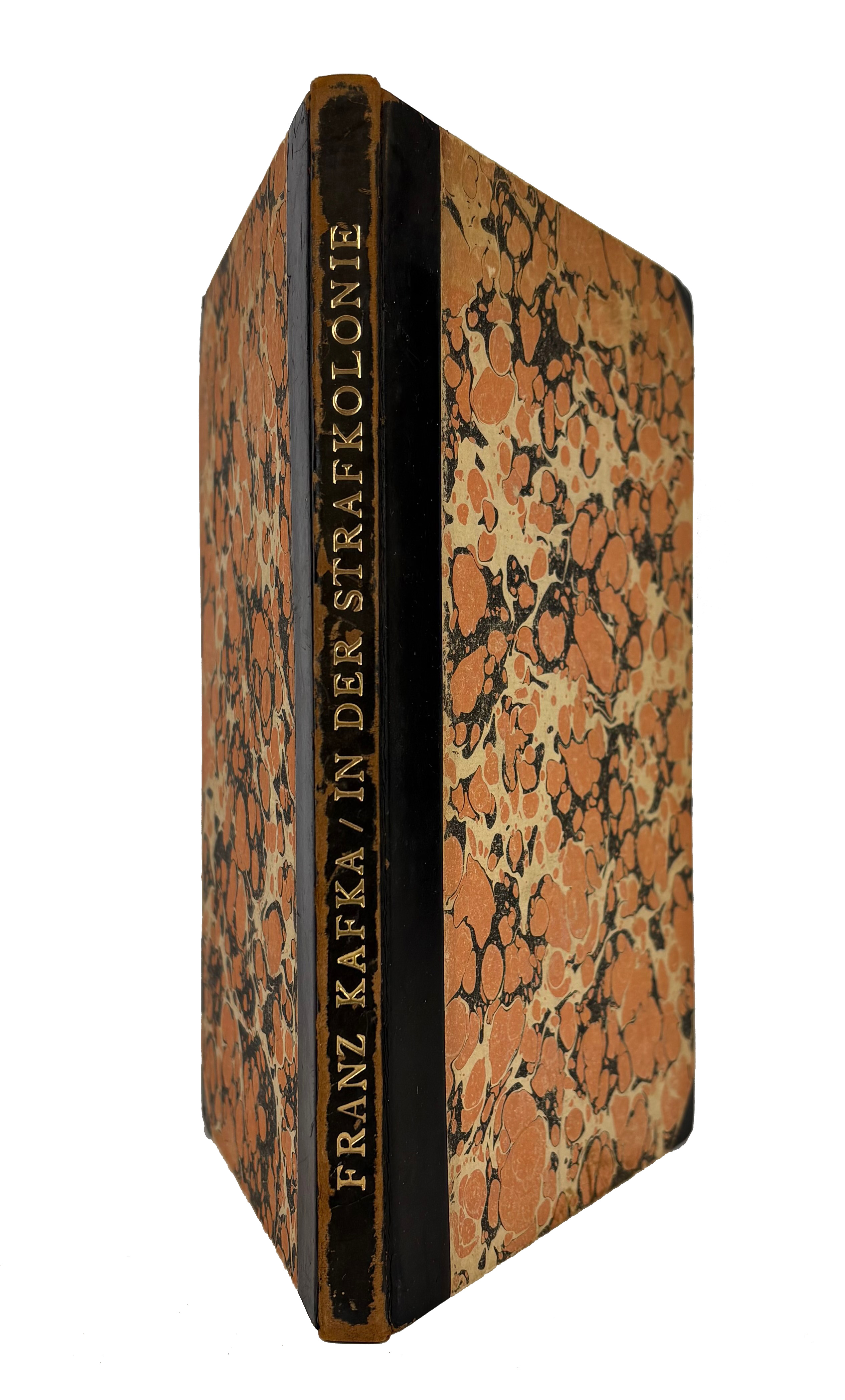 KAFKA, F. In der Strafkolonie. Lpz., K. Wolff Verlag, 1919. 69, (3) pp. Ohcf. w. marbled paper sides, spine lettered in gilt, cream endpapers, white silk page marker, t.e.g. (Extremities slightly chafed, but a very good copy). (Drugulin Drucke, Neue Folge Bd. 4).