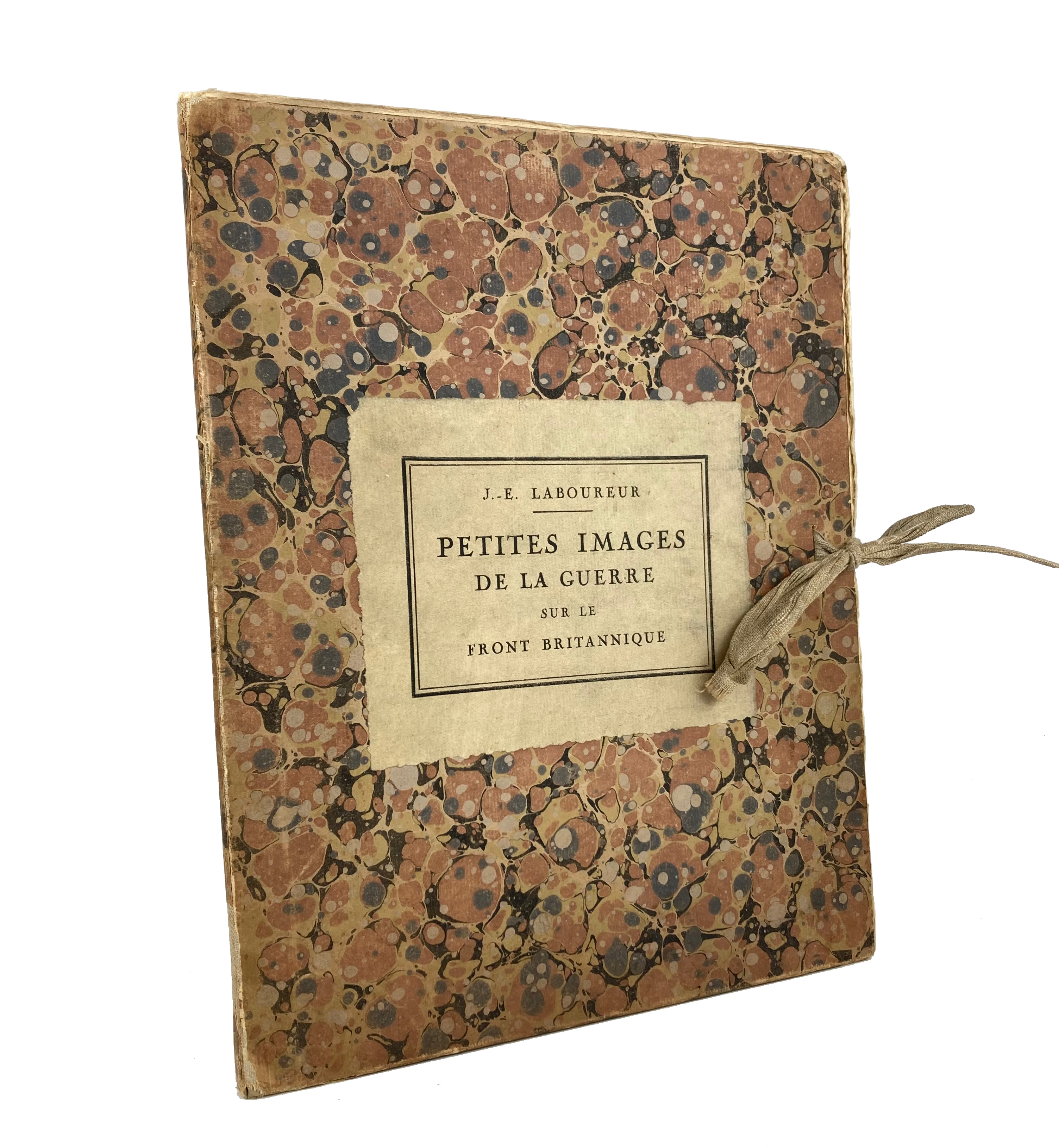 LABOUREUR, J.-É. Petites images de la guerre sur le front Britannique. Précédées d'une Lettre sur les spectacles de la Guerre de R. Allard. Paris, A. Vernant, (1917). xi text-pp. 9 copper engrs. 180 x 140 mm image size. Folios loose & folded as issued. Owrps. In ohcl. portfolio w. marbled sides & title-plate on front side, w. ties. (Portfolio age-toned, inside clean & bright).