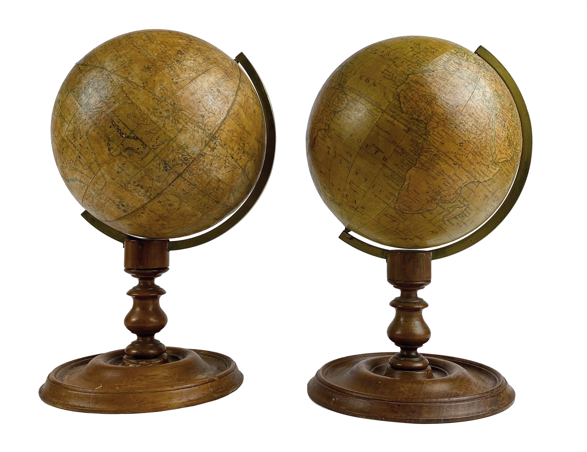 Charming pair of globes. Terrestial globe: "Newton's New & Improved Terrestial Globe, Containing the Latest Discoveries. 66 Chancery Lane London" (not dated). Celestial globe: "Newton's New & Improved Celestial Globe. 66 Chancery Lane London. 1846." - The Newton family were probably the finest globe makers of early 19th c. England. John Newton (1759-1844) trained with Thomas Bateman before founding the company in 1780. In the Regency period John was joined by his son William Newton (1786-1861) and the firm became J. & W. Newton trading at 97 Chancery Lane. From 1831 to 1841 the Newtons joined in partnership with Miles Berry and traded as Newton, Son and Berry. After 1841 the company was taken over by the eldest grandson William Edward Newton (1818-1879) and traded as Newton and Son from premises at 66 Chancery Lane.€ 1500