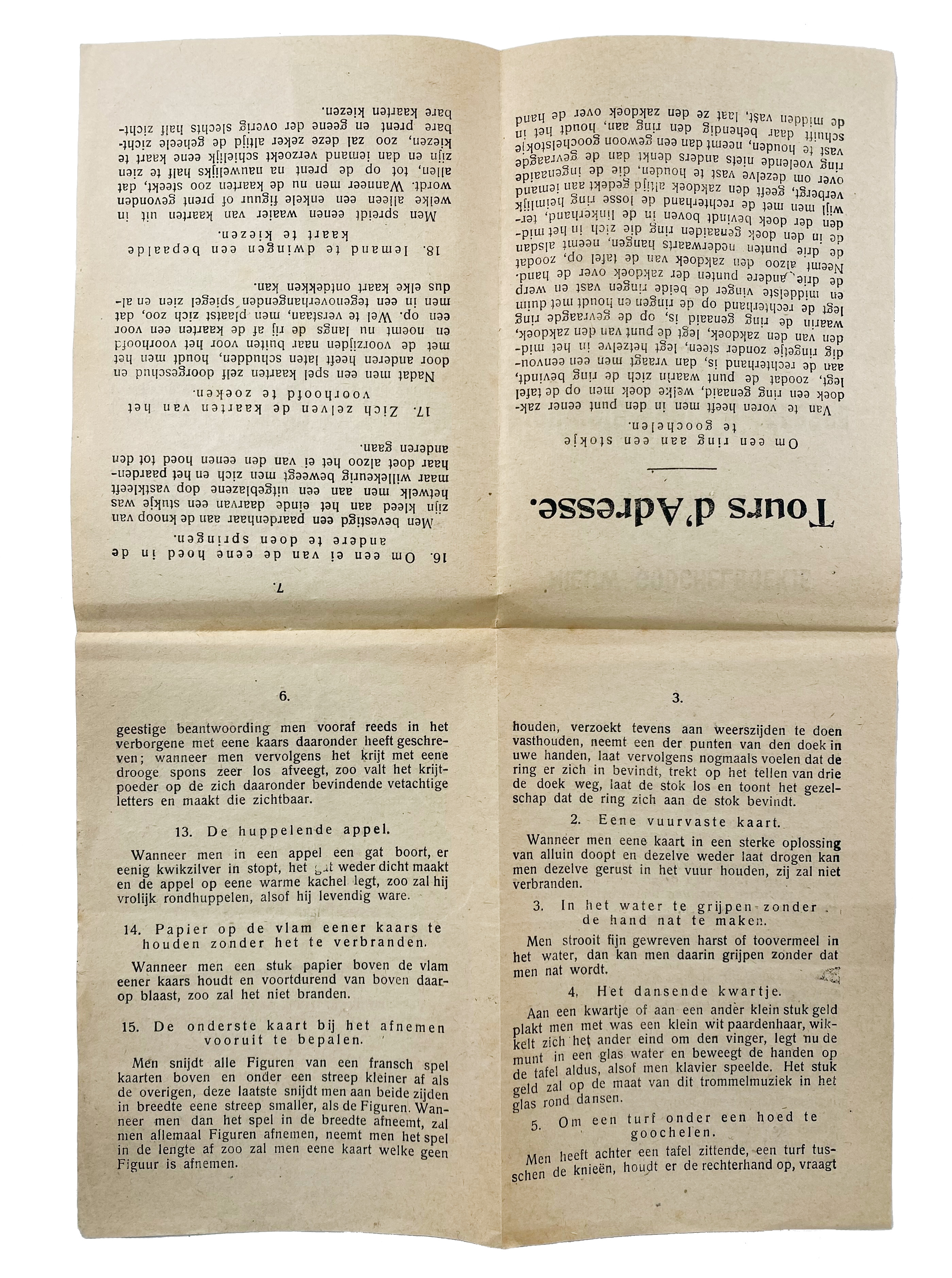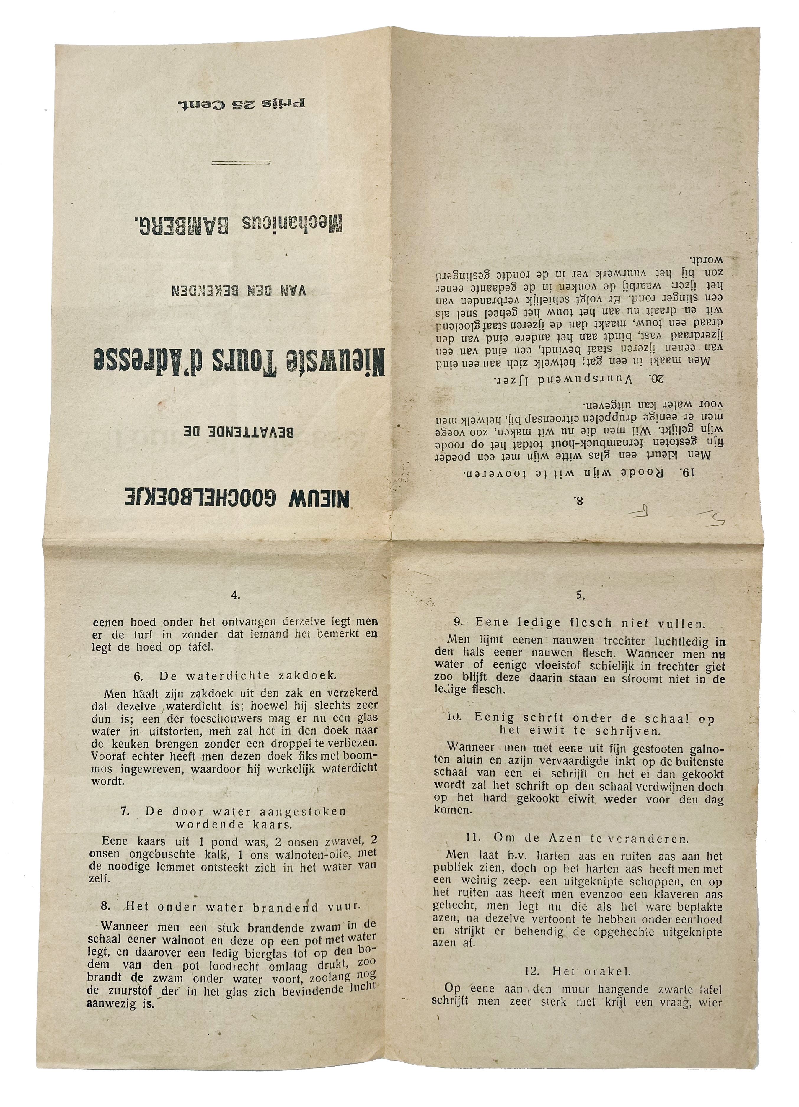 This rare booklet by David Leendert Bamberg (1787–1869), represents an early contribution to the art of magic by one of the Netherlands' most influential families of magicians. David Leendert Bamberg, son of Eliazer Bamberg, was a skilled mechanic and magician who laid the foundation for the legendary Bamberg dynasty. His innovative mechanical tricks and illusions were highly regarded in the 19th century, and this booklet offers a glimpse into the techniques and secrets of his craft. His legacy is carried on by later masters of magic, including his great-grandson Theodore Bamberg ('Okito'), one of the most celebrated magicians of the 20th century. - Extensively: Ko Sturkop, "Wees aimabel". De Bamberg-dynastie van goochelaars. - Only 1 copy in NCC (Groningen).
