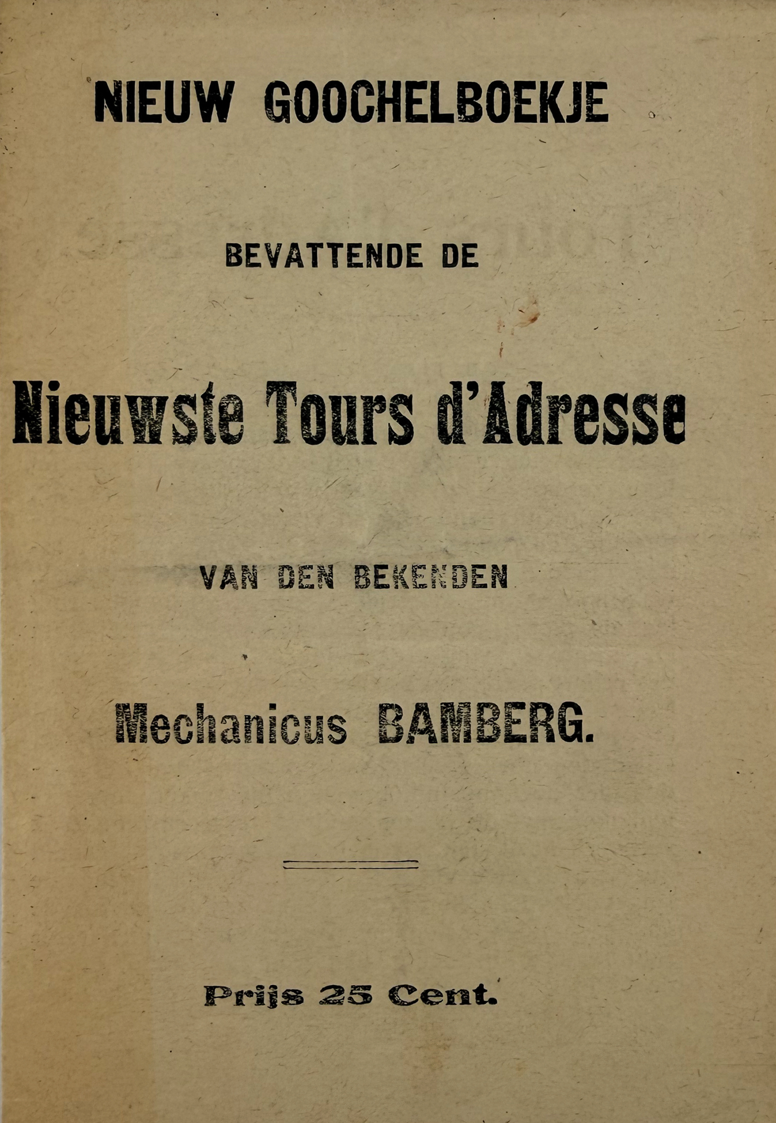 BAMBERG, (David Leendert). Nieuw Goochelboekje. Bevattende de Nieuwste Tours d'Adresse van den Bekenden Mechanicus Bamberg. (N.pl., 1861). (8) pp. (=1 fold. leaf). (Sl. age-toned).