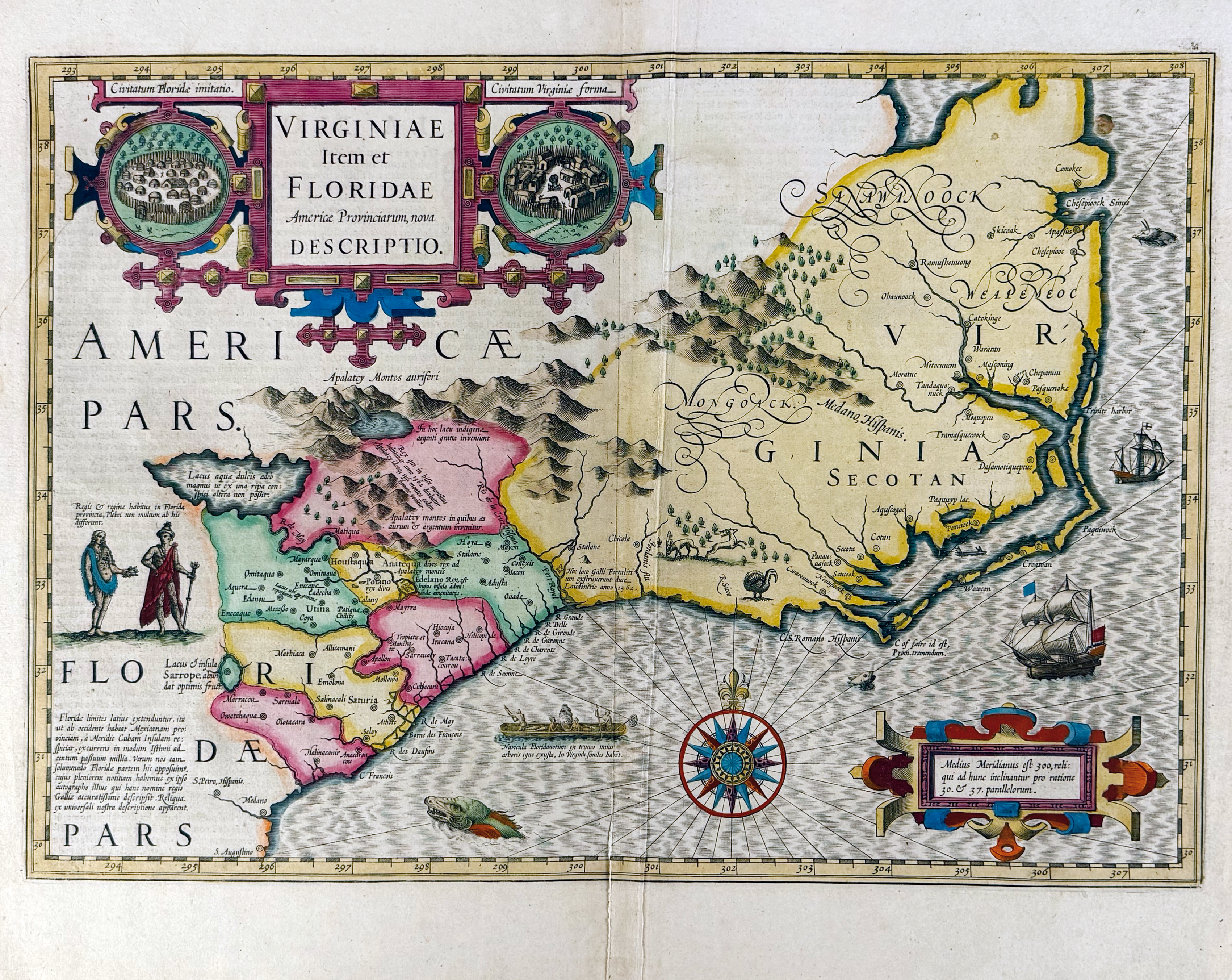 This beautiful map is embellished with various game, including a wild turkey. Examples of Indian villages in Florida and Virginia appear in cartouches either side of the title. - French text on v° ('371' and '8D'). Burden 151; V.d. Krogt 9400:1A.€ 1000